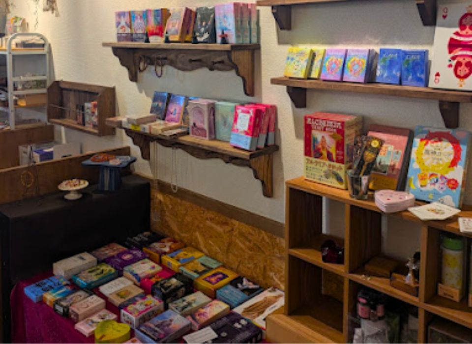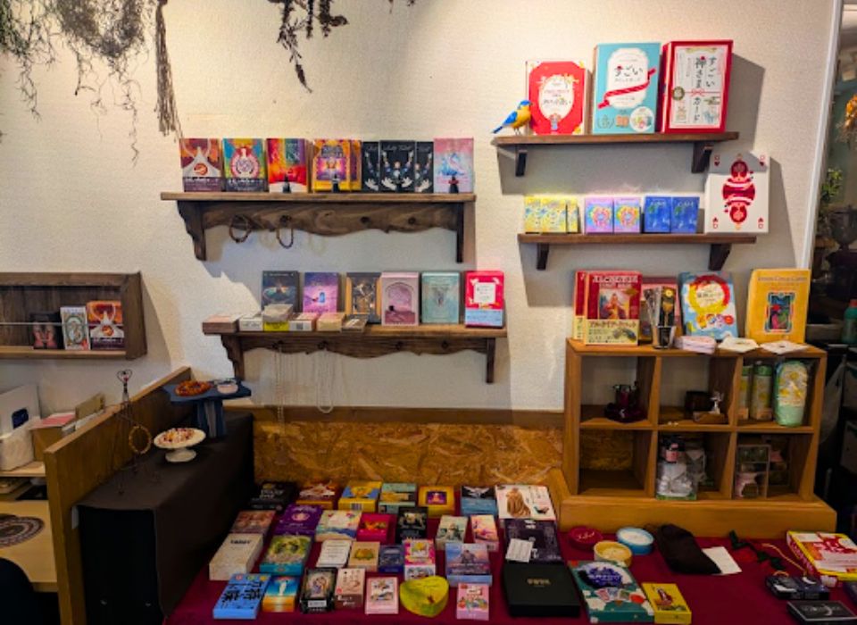 普段は予約制でタロットや手相、西洋占星術の鑑定を受けられるほか、少人数制の講座やワークショップも開催されています。扉を開けると、ずらりと並ぶオラクルカードやタロット、パワーストーン──まるで“星の本棚”のような空間に、思わず目を奪われます。